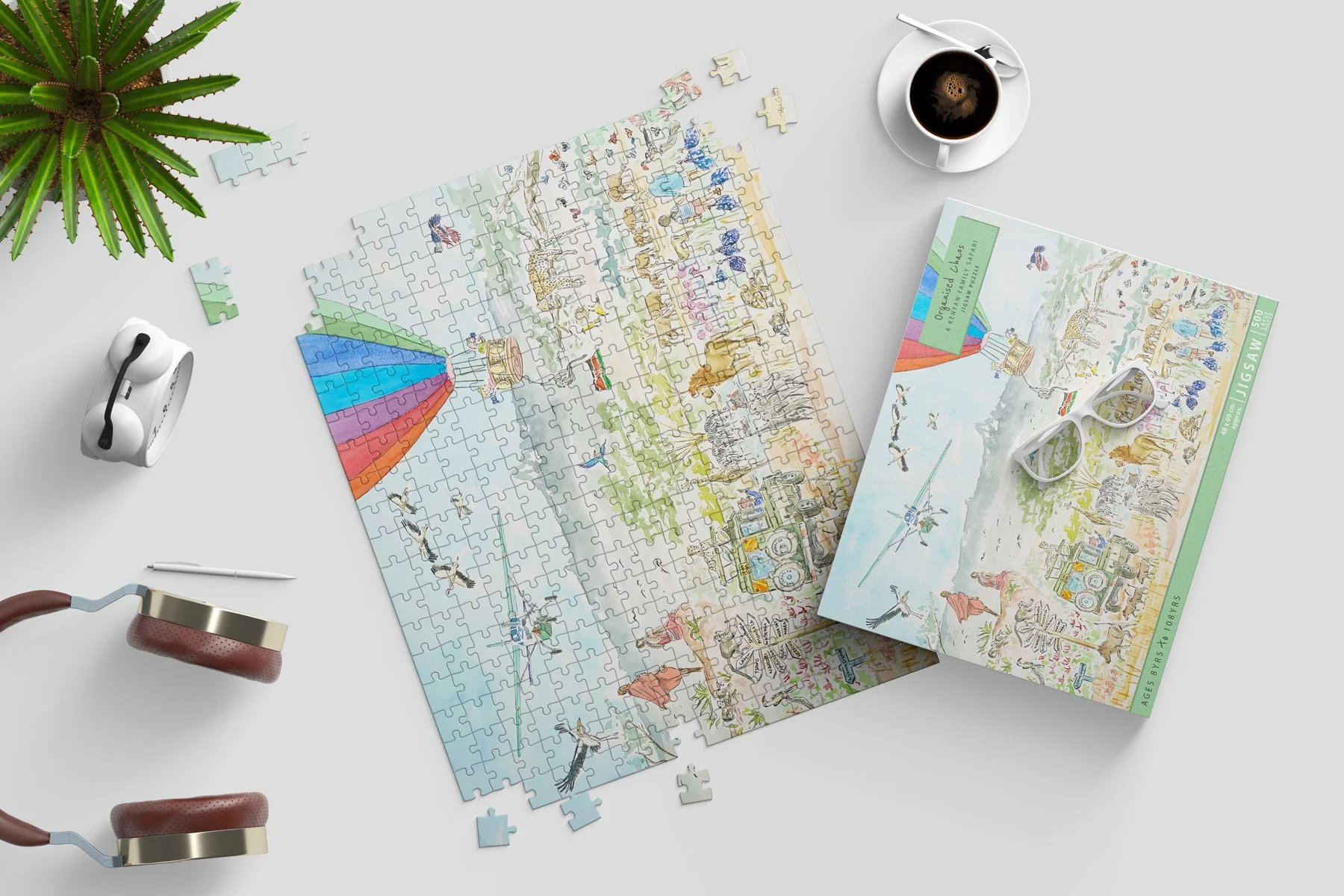 Both puzzles were illustrated from original Tall Chin artwork inspired by travel in East Africa. The landscapes contain a number of small details that reveal themselves gradually as the puzzle comes together.